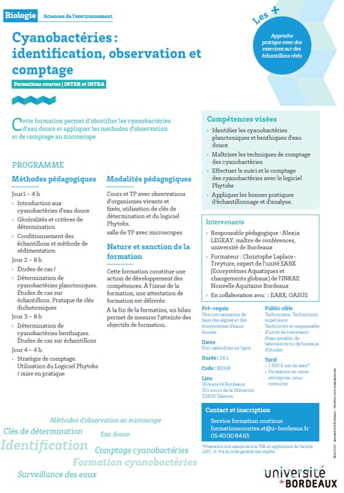 Une formation courte (24h) intitulée “Cyanobactéries : identification, observation et comptage” permettant d'identifier les cyanobactéries d'eau douce et d'appliquer les méthodes d'observation et de comptage au microscope est proposée par l'Université de Bordeaux. Cette formation aura lieu du 6 au 10 janvier 2026. Christophe LAPLACE-TREYTURE (INRAE, EABX ; Pôle ECLA) en est le formateur. Cette formation est ouverte aux techniciens, techniciens supérieurs, techniciens et responsables d’unités de traitement d’eau potable, de laboratoires ou de bureaux d’études.