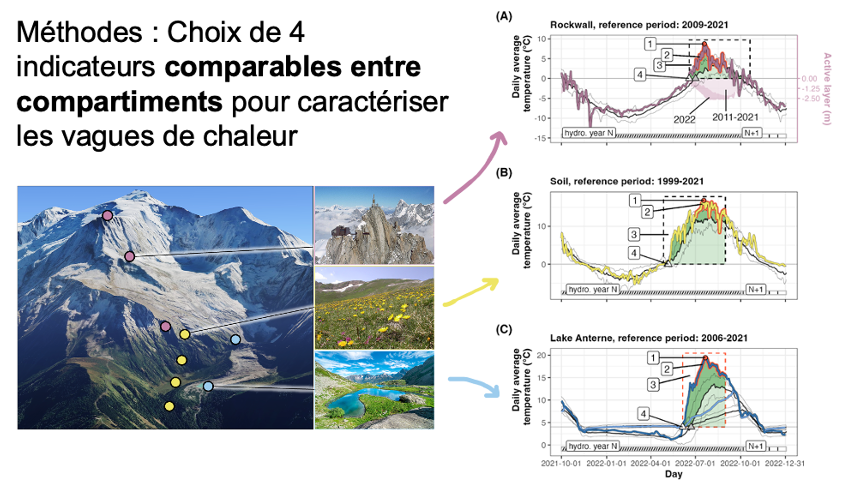 Ce constat d’année exceptionnelle étant largement partagé, des chercheur.es et gestionnaires se sont réunis grâce à la Zone Atelier Alpes pour mettre en commun les données dont iels disposaient. Au total, des données haute-fréquence (1 mesure par heure) pour 95 sites ont été assemblées et le format homogénéisé, puis une réflexion a eu lieu entre expert.es pour identifier des indicateurs commun entre compartiments qui permettraient de quantifier la réponse des différents compartiments.