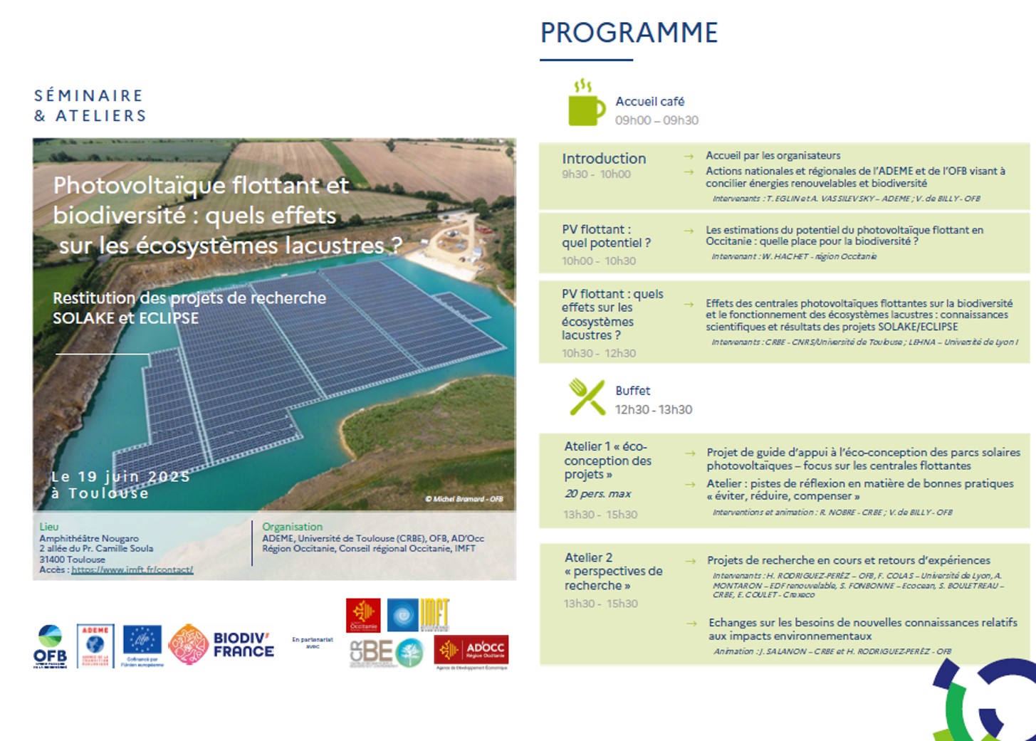 Dans le contexte actuel de développement des énergies renouvelables, l’installation de centrales photovoltaïques flottantes sur les plans d’eau progresse. Le niveau de connaissance sur les conséquences écologiques sur la biodiversité des plans d’eau est actuellement insuffisant. Le 19 juin 2025 à Toulouse, un séminaire est organisé par l’OFB, l’ADEME, le CRBE de l’Université de Toulouse, l’Agence de Développement Économique de la Région d’Occitanie et l’IMFT pour restituer les résultats du projet SOLAKE/ECLIPSE financé par l’OFB, l’ADEME et le programme Marie Sklodwska-Curie Actions de l’UE. Le séminaire sera suivi de deux atelier sur l’éco-conception des centrales photovoltaïques flottantes et les perspectives de recherche.