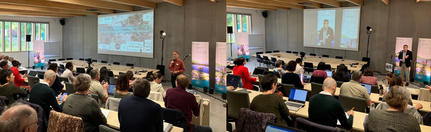 Indeed, in Southwestern France—but not exclusively—many lakes and river stretches are subject to various human activities (e.g. fishing, hunting, swimming, water sports, etc.). Some of these aquatic environments are also used as sources of drinking water. However, they are sometimes, either regularly or occasionally, affected by massive proliferations of potentially toxic benthic cyanobacteria.These proliferations can restrict some or all uses of these environments (e.g. presence of toxins, algal mats, etc.) and may lead to animal deaths, including pets and wildlife. It is therefore essential to understand the mechanisms driving these blooms, to assess toxicological risks, to stay informed about regulatory developments regarding their monitoring and management, and to explore new monitoring approaches, such as how to analyze the algae and their toxins. This conference day aimed to foster exchange on these topics, to benefit from the experiences shared by environmental managers, and to better understand their needs and expectations.